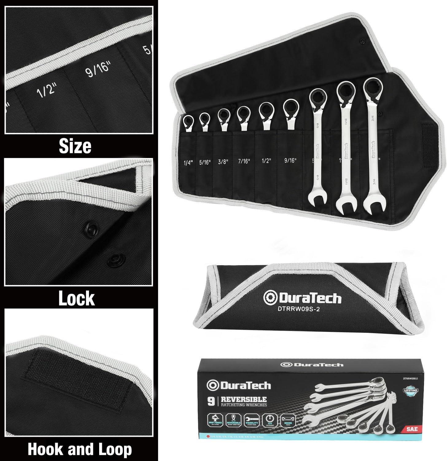 DURATECH Reversible Ratcheting Combination Wrench Set, SAE, 9-Piece, Open end Spanner with Rolling Pouch, 1/4'' to 3/4", 12 Point, CR-V Steel quantity