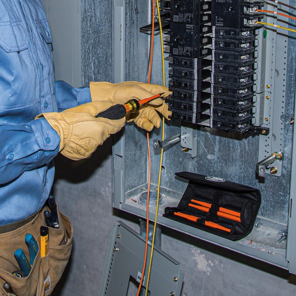 Klein Tools' Interchangeable Insulated Screwdriver Set includes an insulated handle and 5 interchangeable insulated blades for quick changes on the job. The auto-eject mechanism works with just a twist, allowing you to change or flip blades simply and easily. A bright orange coating of insulation protects from electrical shock, as well as being flame and impact resistant.