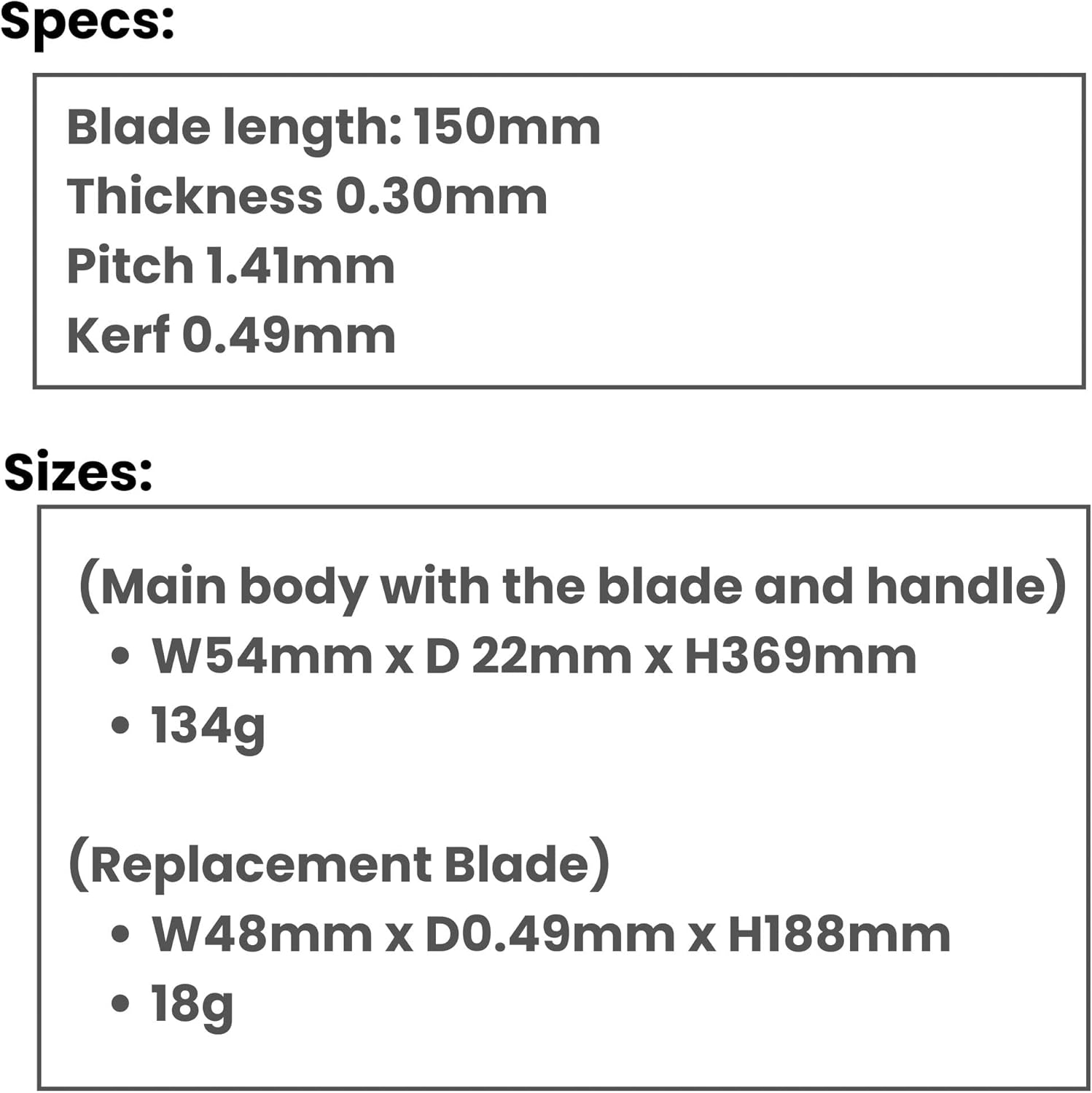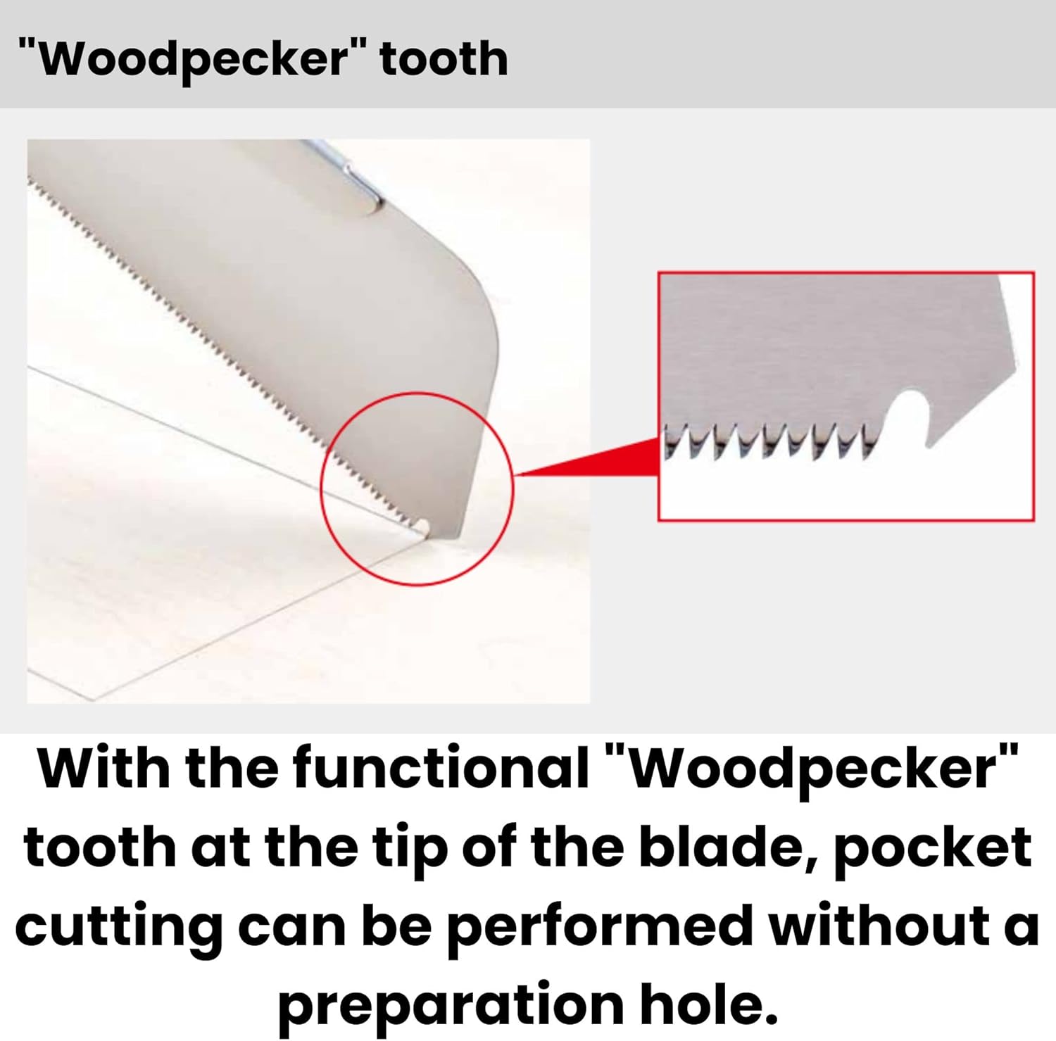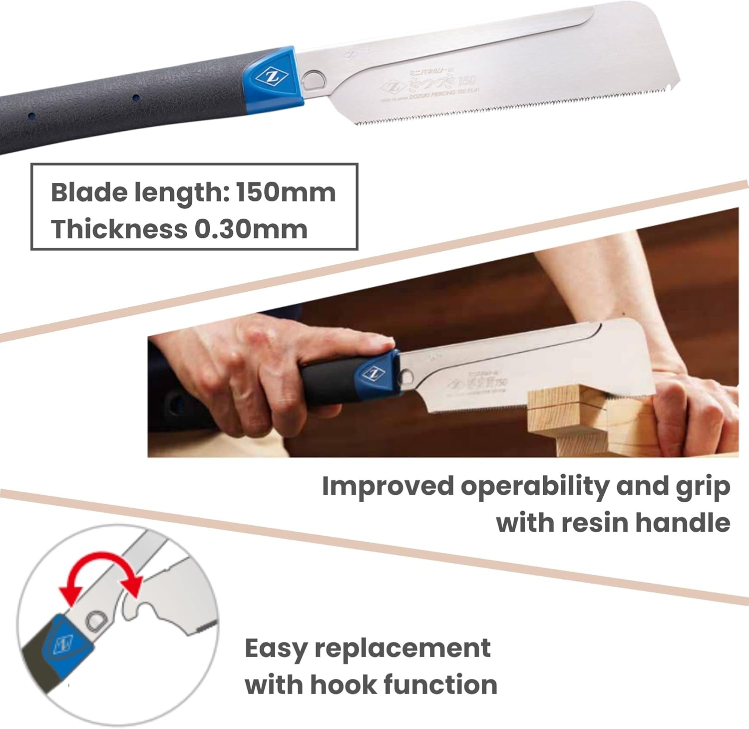 Features – A handy, compact tool for precision horizontal sawing. – You can cut windows by aligning the woodpecker blade at the tip with a ruler. – Recommended for a wide range of tasks, from electrical work to DIY projects. Uses – Precision horizontal sawing and window opening – Can cut cedar, cypress, Douglas fir, and pine plywood. Specifications – Blade Length (mm): 150 – Overall Length (mm): 188 – Blade Pitch (mm): 1.41 – Sheet Thickness: 0.30mm – Cutting Width: 0.49mm Material/Finish – Blade: Alloy Tool Steel (SKS5)